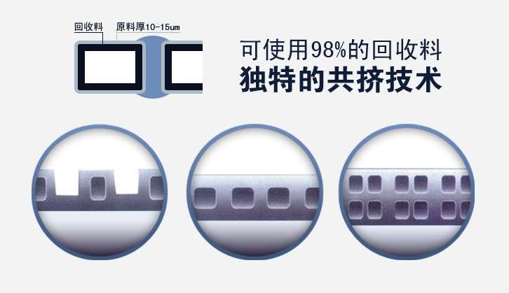 采用雙階式減壓螺桿,帶有特殊的促進混煉塑化元件,在高扭矩,高溫控精度的配合下,保證可全部使用回收料生產(chǎn)。
